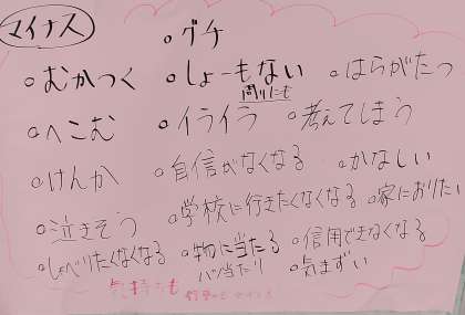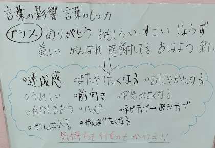 1組では「言葉の影響、言葉の力」 というテーマで、プラスの言葉やマイナスの言葉が、周りにどのような影響を与えるのかを考えました。
