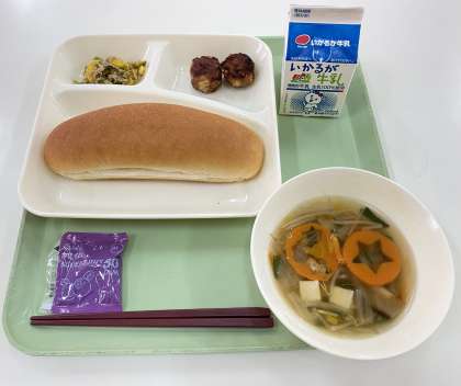 今日の給食は、あげシューマイ.とうふのスープ.ツナとチンゲンサイのいためもの.コッペパン.ブルーベリージャム.牛乳です。