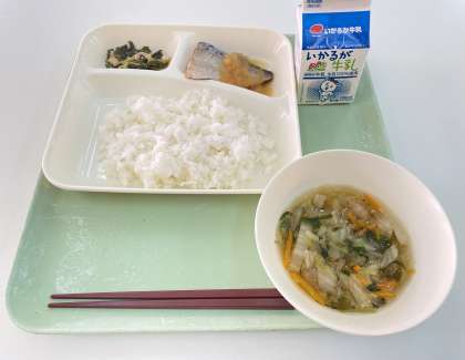 さばのみぞれかけ.こまつなのにびたし.すまし汁.ご飯.牛乳です。