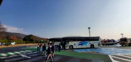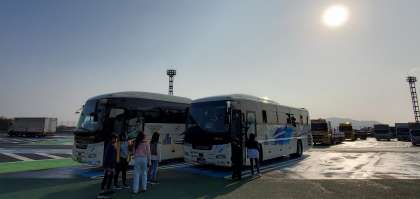 バス車内で、子どもたちはビデオを鑑賞したり眠ったりしています。