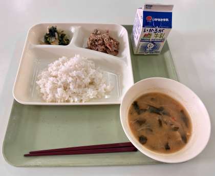 今日の給食は、豚肉のごまだれ焼き.きくなとはくさいのおひたし.みそ汁.ご飯.牛乳です。
