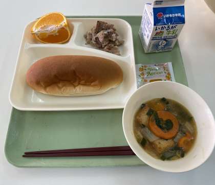 今日の献立は、豚肉のオイスターソース炒め.あつあげと大根の中華煮.デコポン.コッペパン.アプリコットジャム.牛乳です。