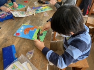 図工では、「くぎうちビー玉」に取り組んでいます。コリントゲームや迷路ゲームを作っています。もうそろそろ完成!楽しみです!