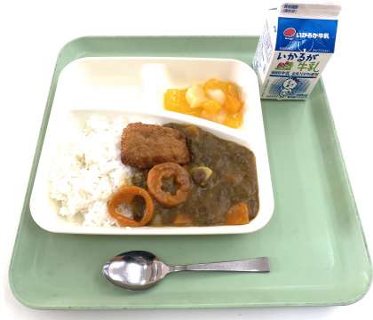 今日は、入学祝い献立です。カツカレーライス.フルーツゼリー.牛乳です。大人気のメニューで、食べ残しもほとんどゼロでした○