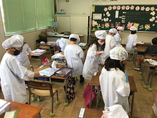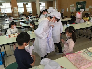 4月11日(月)より、給食がはじまりました。エプロンをつけたり、配膳をしたりとはじめてのことばかりでしたが、6年生のお兄さんお姉さんが優しく教えてくれました。