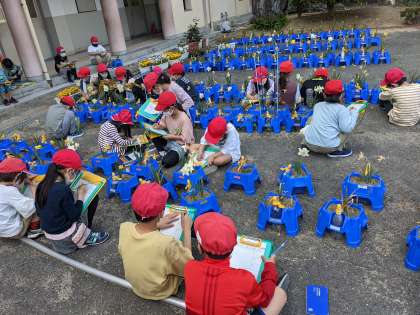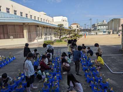 2年生の後半に植えて、早いものは3月頃には咲いていました。もう枯れてしまっているものもありましたが、遅咲きのスイセンを観察し、春を感じることができました。