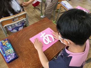 紙粘土を使って、平仮名「あ」を作りました。紙粘土の感触を楽しんだ後、丁寧に一画ずつ作ることができました。