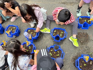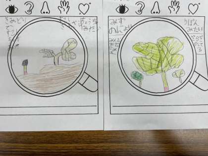 あさがおの芽が出ました。目でよく見たり、手ざわりを確かめたりして、よく観察しました。