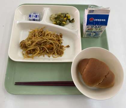 今日の献立は、カレースパゲッティ.レタスとコーンのサラダ.固形チーズ.黒糖パン.牛乳です。