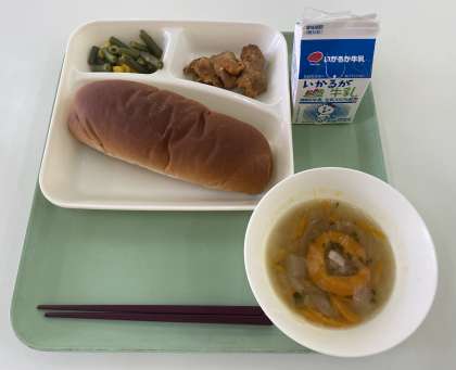 今日の給食は、鶏肉のカレーマヨネーズ焼き.さんどまめとコーンのサラダ.てぼ豆のスープ.黒糖パン.牛乳です。