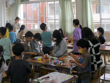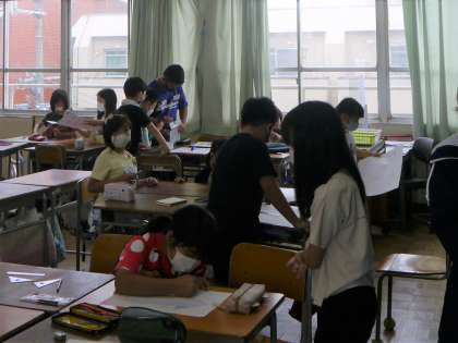 当日は、子どもたちがたてわり班でお店を回ったり、お店を出したりしますが、今日の1時間目は、そのお店の準備を行いました。受付係や案内係など役割決めを行ったり、ポスターやルール説明を画用紙に書いたりしました。