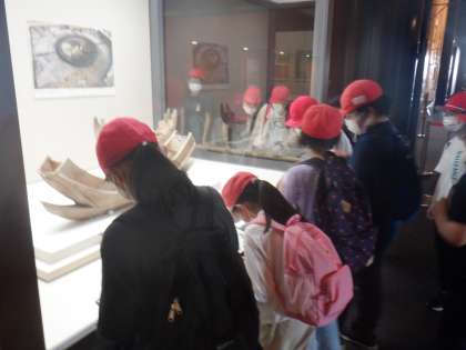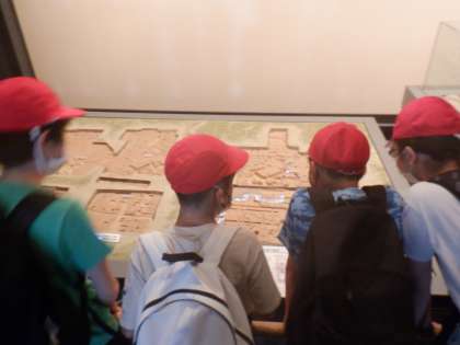 こちらは大阪歴史博物館での見学の様子です。子どもたちは、その時代に使われていたものや暮らしの様子、説明などを注意深く見ていました。マナーよく見学する姿に感心しました。
