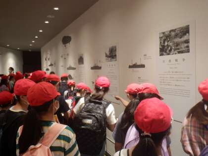 こちらは、ピースおおさかでの見学の様子です。70年以上前に大阪で起きた出来事に触れ、子どもたちは神妙な表情でした。ワークシートの欄だけでは足りず、裏面や別紙に熱心にメモを書いている子どももいました。平和や戦争についてたくさんのことを学びました。また、ご家庭でも話を聞いてあげてください。