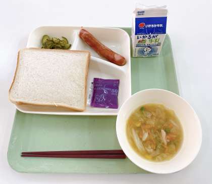 今日の献立は、ウィンナーのケチャップソース.スープ.きゅうりのサラダ.食パン.ブルーベリージャムです。