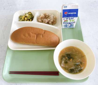 今日の給食は、鶏肉のからあげ.中華みそスープ.きゅうりとコーンの甘酢あえ.黒糖パン.牛乳です。