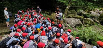 川のせせらぎを聴きながら、先生からの指示をしっかりと聞いている子どもたち。