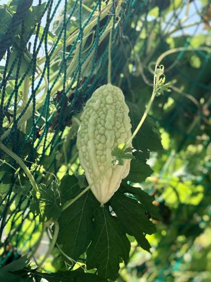 緑のカーテンの裏側をのぞいてみると・・・新しい種類の実がなっていました!