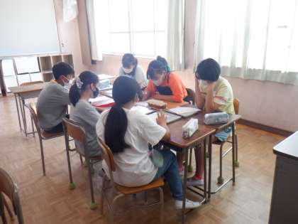 下の写真は保健・美化係です。部屋での過ごし方、入浴の仕方、健康観察表の内容を話し合いました。