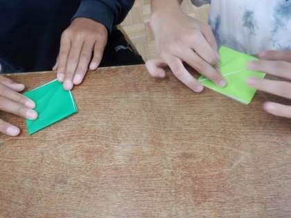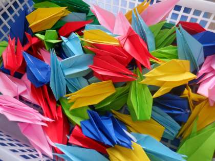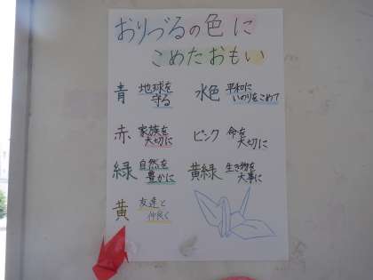 修学旅行では、みんなで作った折り鶴を平和記念公園に奉納します。各学年に協力してもらうために、まずは自分たちで鶴を折りました。子どもたちで折り紙の色ごとに込める願いを考えました。1人ひとり、どんな願いを込めたいか考えて折ってほしいです。