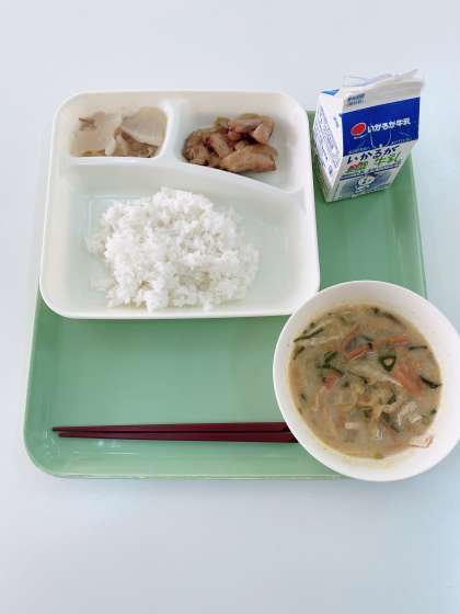 今日の献立は、鶏肉の甘辛やき.だいこんの煮もの.みそ汁.ご飯.牛乳です。