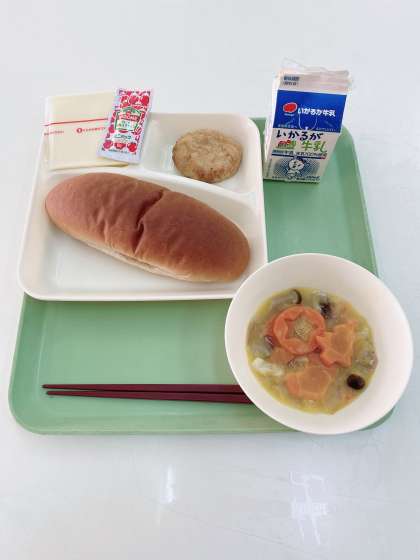 豆腐ハンバーグは、チーズと一緒にパンに挟んで、ハンバーガー風にして食べた人も多かったです。カリフラワーのスープ煮には、ツリー.星.くつ下のラッキーにんじんが入っていました。