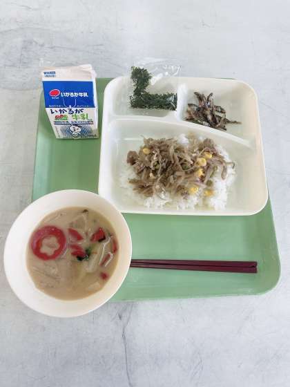 今日の給食は、きんぴらちらし.ごまめ.雑煮.牛乳です。