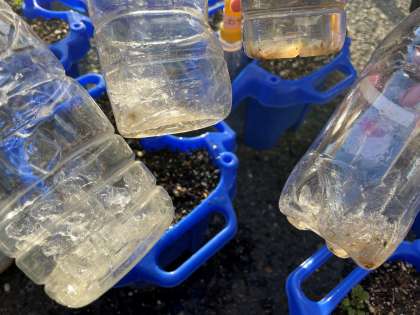 今日の朝は、チューリップの水やりをしに行った子どもたちが大騒ぎ!水やり用のペットボトルの中に入っていた水が凍って、氷ができていました!