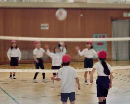 1月の体育は、キャッチバレーボールをしています。コートの空いているところを狙って投げ入れたり、素早く投げ返したりして、得点を取れるようにがんばっています。