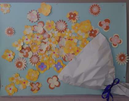 2年生のろうかに大きな大きな花束の掲示が完成しました!卒業を来月に控えた6年生に、これまでのありがとうの気持ちを込めてお花を作りました。