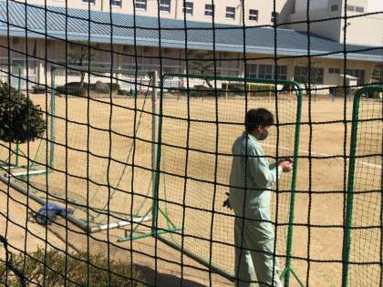 管理作業員さんが、サッカーゴールや防球ネットの破損部分をていねいに直してくれていました。(写真)