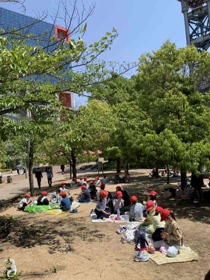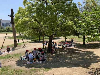 いい天気の中、みんな嬉しそうにお弁当を食べていました。