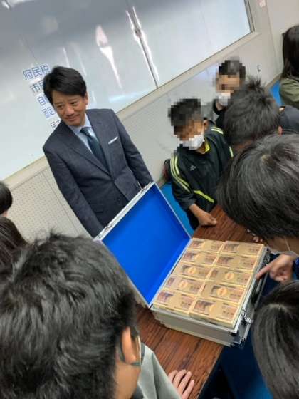 税金クイズでは、「学校を建てるのにかかる費用は?」という問題がありました。約13億円かかるそうです。「さすがに13億円は持ってこれませんが…」と、1億円をアタッシュケースに入れて持ってきてくださりました!(もちろんレプリカです。)わぁっと歓声があがると共に、目の色が変わった人、思わず立ち上がって覗き込む人などなど、様々な反応を見せていました。