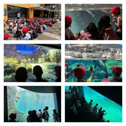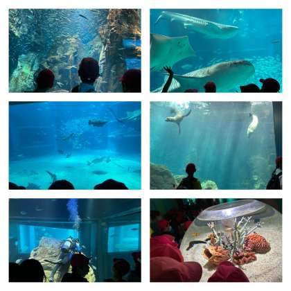 大きなジンベイザメやイルカなど、様々な生き物がいました。みんな夢中になり、水槽を眺めていました。