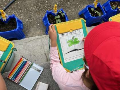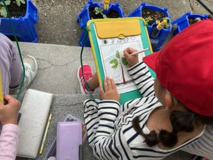 ?1年生が「大きくなあれ。大きくなあれ。」といいながら植えたアサガオの観察に行きました。