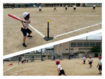 体育では、ベースボール型のゲームに取り組んでいます。今日は試しのゲームをしました。得点が入ると、大盛り上がり!互いに励ましの声をかけながら、取り組むことができました!