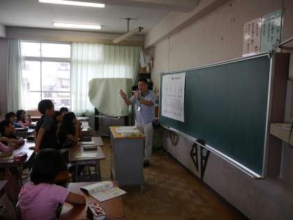 写真(上):絵の具を使って、ちょうの羽の模様を色づけしています。