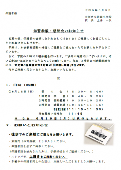 詳細につきましては、6月5日配付「学習参観・懇談会のお知らせ」のお手紙をご確認ください。