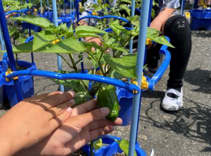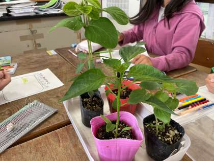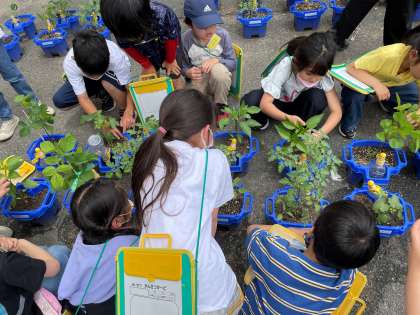 5月に植えた、ミニトマト・えだまめ・ピーマン・オクラが大きく育って実をつけてきました。子どもたちは、毎日、水やりをがんばっています。「ふわふわの毛が生えてる!」や「むらさきの花が咲いた!」など、よく観察もしています。収穫が楽しみです。
