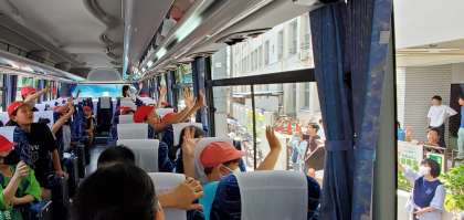 たくさんの保護者の方や教職員に見送られ、バスは一路、信太山青少年野外活動センターをめざし出発しました。