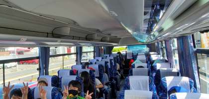 それぞれのバス車内では、子どもたちや先生方のリクエストに基づいて用意された音楽がかけられ、のんびりとくつろいでいます。