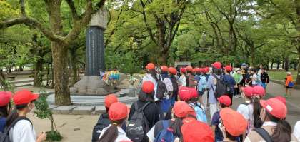 平和集会の後、平和記念公園内を歩き、園内の碑を見ながら資料館へ向かいました。