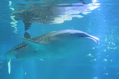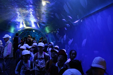 子どもたちは、目を輝かせていろいろな生き物たちを見て回りました。特に、大水槽で展示されているジンベエザメを見たときは、「ジンベエザメや!大きいなぁ〜!!」と大興奮していました。