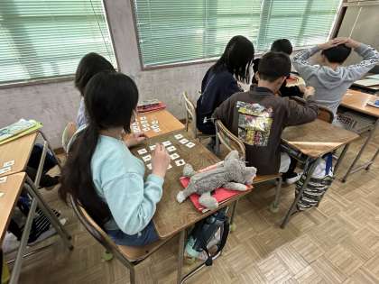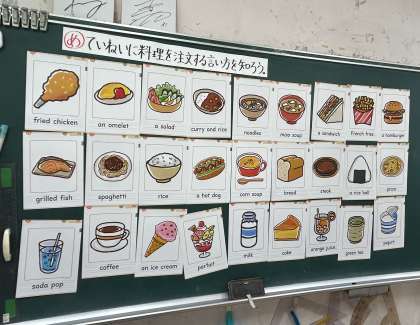 英語では、料理の注文の言い方を学習しています。30個以上の料理の名前を新しく学び、ゲームなどを通して楽しく覚えています。今日は先生の注文した内容を覚え、正しく料理カードを並べるというゲームをしました。全問正解者はシールをゲットすることができました。