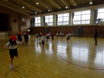 体育館で行ていた2組の体育では、多様な動きを取り入れて体を動かしながらウォーミングアップを行い、元気いっぱいに活動していました☻