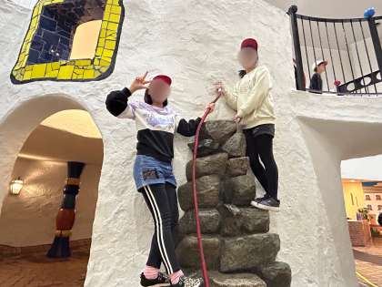 キッズプラザ4階の「こどもの街」は、すべてが曲線でつくられており、迷路のような回廊・曲がった壁・形も色も違う窓など、まるで街全体が生き物のようでした。壁をのぼったり、つり橋を渡ったりと思いっきり身体を使って遊んでいました。