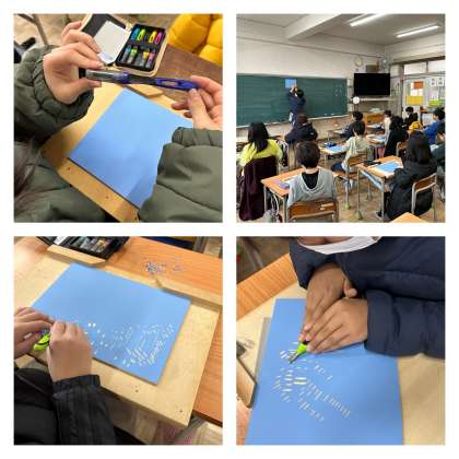 2月は木版画をします。はじめて使う彫刻刀にドキドキ!1時間目は、彫刻刀の名前や使い方の確認をしました。約束を守って使えば、怪我をすることはありません。先生の話をよく聞いて、集中して学習に取り組んでいきましょう!