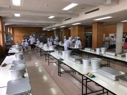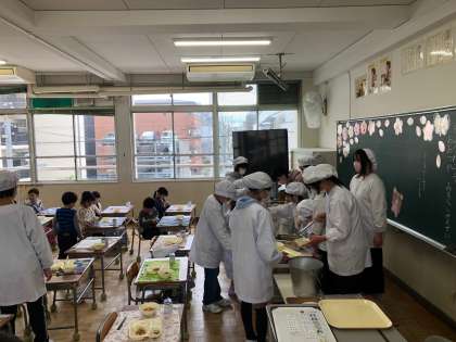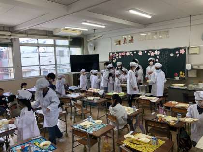 給食調理員さんが春休みの間から入念な準備をくださり、安全・安心でおいしい給食をランチルームにクラスごとに配膳してくださっています。「いただきます」の挨拶をして、教室まで運びます。