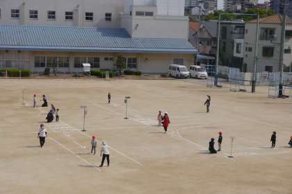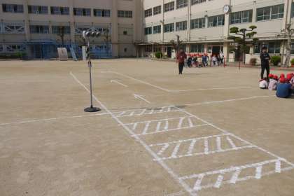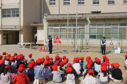 運動場に信号や横断歩道を再現し、安全な歩き方や、道路の渡り方を学習しました。