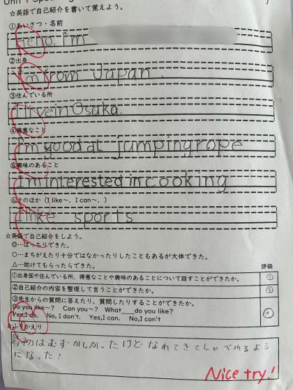など、自分の名前だけでなく得意なことや興味のあることも英語で発表することができました。