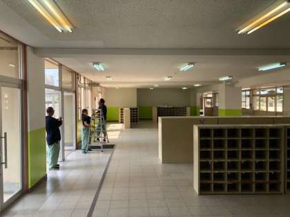 この度、子どもたちが登校しない夏休みを利用して、下足室の壁、天井、靴箱をきれいにしてくださいました。